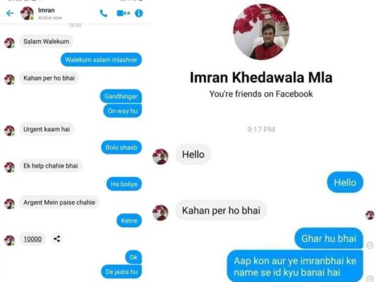 જમાલપુર- ખાડિયાના ધારાસભ્ય ઇમરાન ખેડાવાલાના ફોટો અને તેમના હોદા સાથેનું ફેસબુકનું ફેક એકાઉન્ટ અજાણી વ્યક્તિએ બનાવી સગાસંબંધીઓ- મિત્રોને મેસેજ કરી PAYTMથી પૈસા માંગવામાં આવ્યા હતા. 10,000 રૂપિયાની માગ કરી હતી. ખેડાવાલાના ધ્યાને આ બાબત આવતા તાત્કાલિક તેઓએ આ મામલે તેમના પોતાના સાચા એકાઉન્ટ પર આ માહિતી શેર કરી લોકોને માહિતગાર કર્યા હતા. સાયબર ક્રાઈમના અધિકારીઓને જાણ કરી એકાઉન્ટ બંધ કરાવ્યું હતું. આ મામલે આજે તેઓ સાયબર ક્રાઈમમાં ફરિયાદ નોંધવવા જશે.